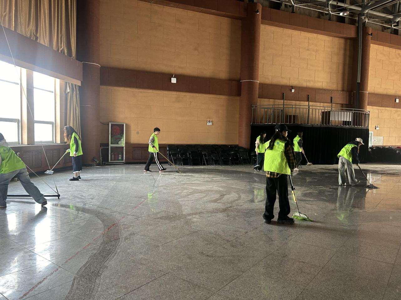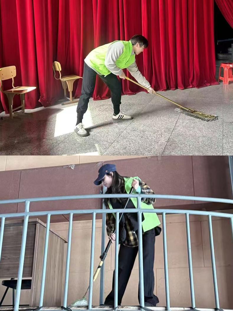 活动当日,文体部的同学们早早集合,带着扫帚拖把等清洁工具,去往素拓场地,大家迅速分组,明确各自任务,有序开展清洁工作。