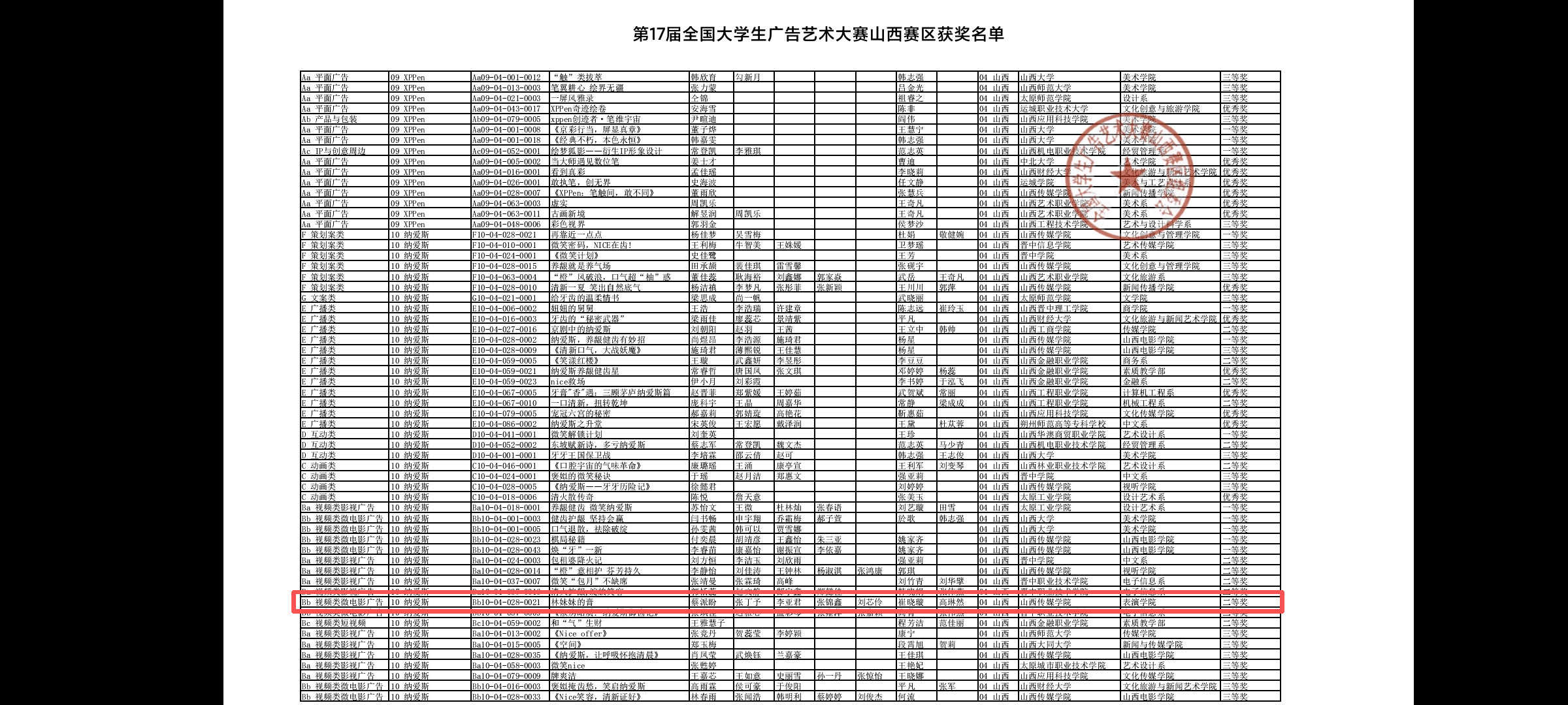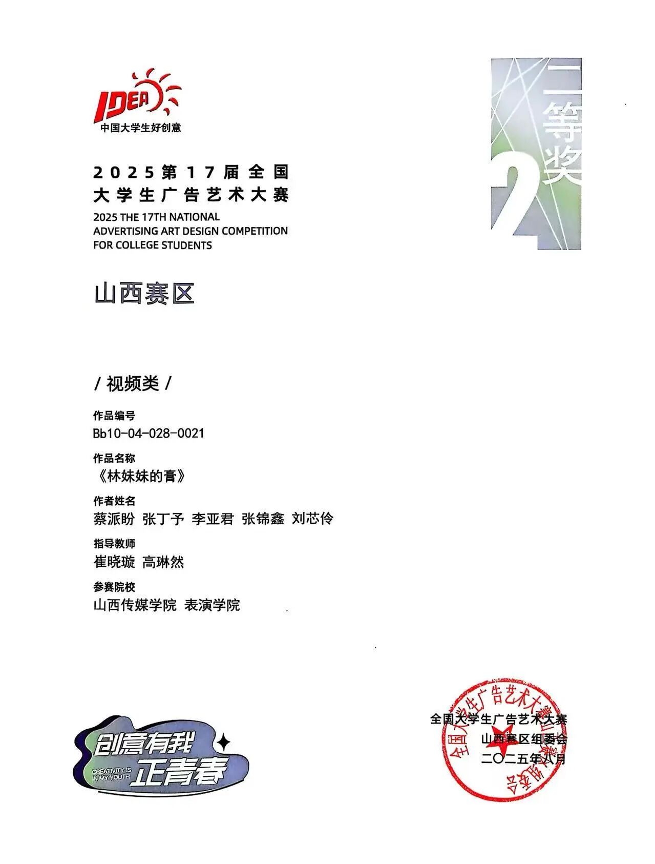 近日,第17届全国大学生广告艺术大赛比赛结果揭晓,24级表演专业学生蔡派盼凭借出色的创意能力与扎实的专业素养,在崔晓璇、高琳然两位老师的指导下,以微电影《林妹妹的膏》一举斩获山西赛区视频类二等奖。荣誉新添,光彩再续,为表演学子点赞!