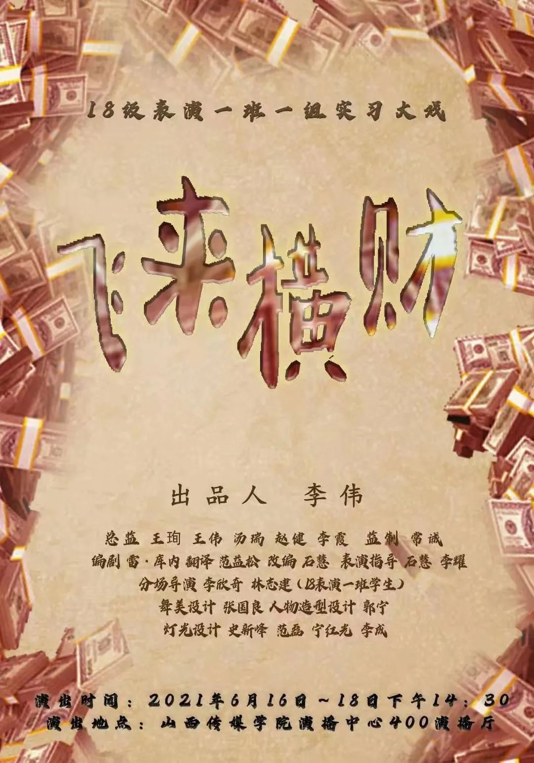 太阳集团tyc151cc2018级表演一班一组实习剧目《飞来横财》将于2021年6月16~6月18日14:30在tyc151cc太阳演播中心400㎡演播厅开演。