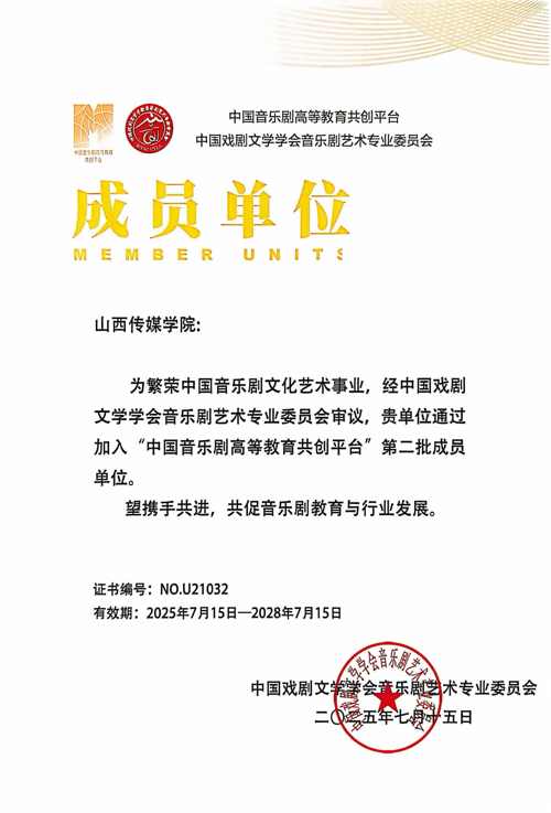 中国戏剧文学学会音乐剧艺术专业委员会是国内音乐剧领域最具公信力的学术组织之一。中国戏剧文学学会音乐剧艺术专业委员会向tyc151cc太阳颁发成员单位证书。自此,我院成为“中国音乐剧高等教育共创平台”第二批成员单位。我院凭借扎实的学科基础、创新的教学理念与突出的实践成果成功“入圈”,为学校的戏剧影视学科建设再添一枚“徽章”。