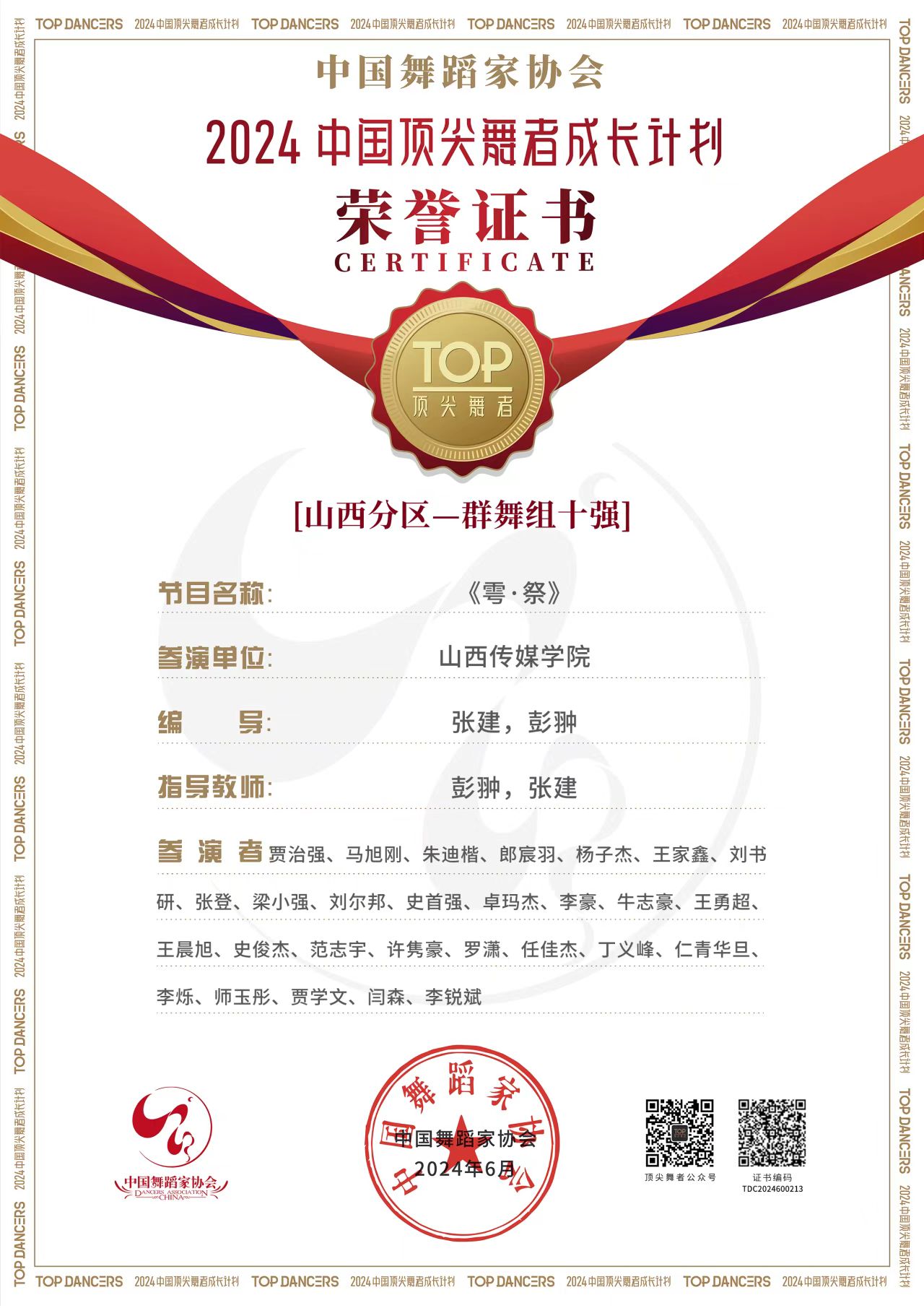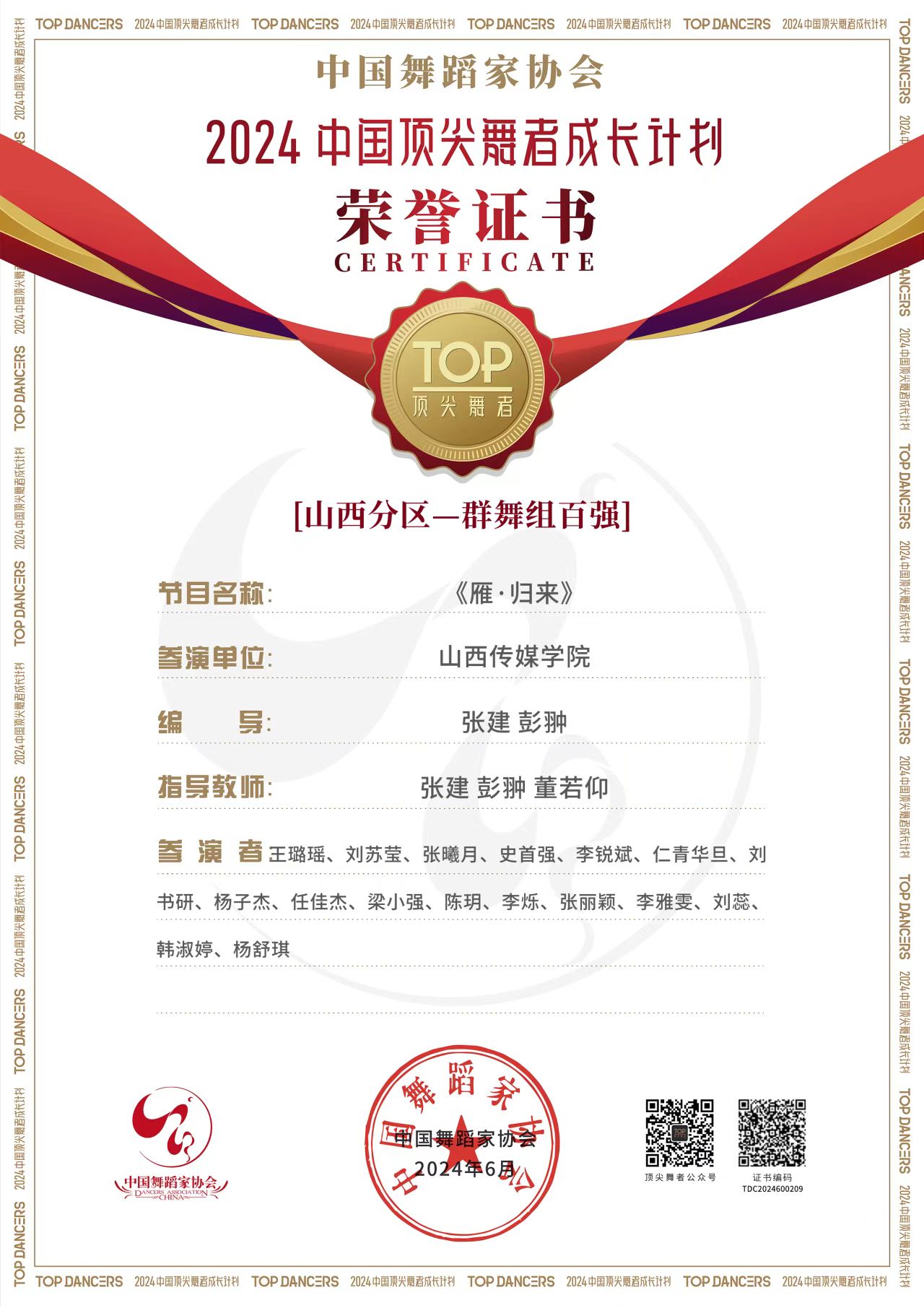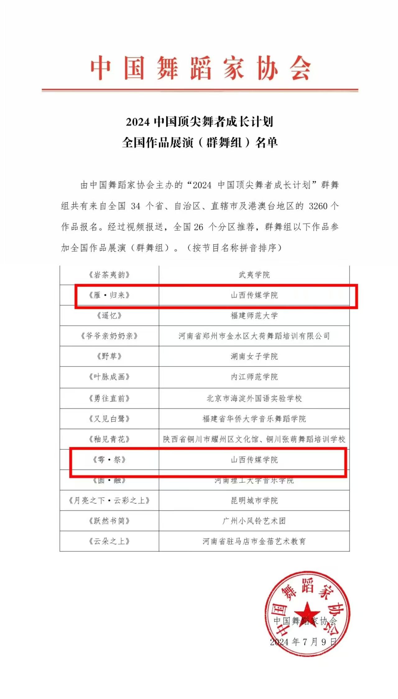我院两部原创舞蹈作品《雩·祭》、《雁·归来》经过顶尖舞者山西赛区评委会严格的评审和激烈的角逐,最终获得推选并入围全国展演。于8月16号至8月21号在浙江·温州进行为期6天的展演。此次展演规模空前盛大,两部作品将继续潜心深入排演,为我校争得更高的荣誉。