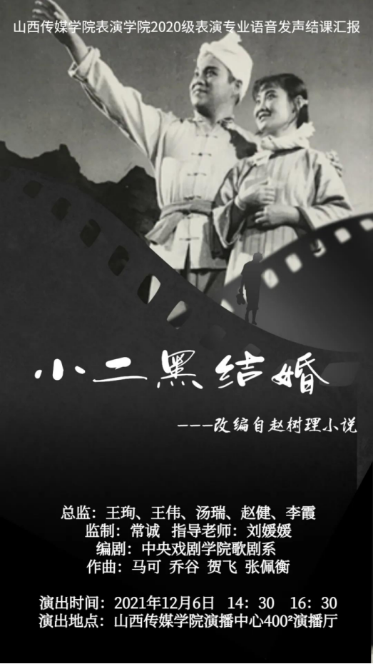 太阳集团tyc151cc2020级表演专业语音发声汇报《小二黑结婚》将于2021年12月6日下午 2:30 (一班) 4:30 (二班)在tyc151cc太阳演播中心400㎡演播厅开演。