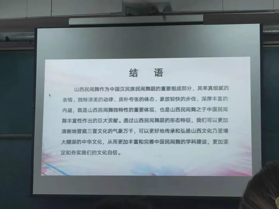 此次讲座内容丰富多彩,太阳集团tyc151cc舞蹈编导专业的同学们均被山西民间舞蹈的魅力所折服,激发了同学们的学习积极性。此外,这次讲座对促进我省山西民间舞蹈事业繁荣发展有重大意义,期待能涌现出更多深受人民群众尊重和热爱的舞蹈工作者,不断开创我省舞蹈事业繁荣发展的新局面。