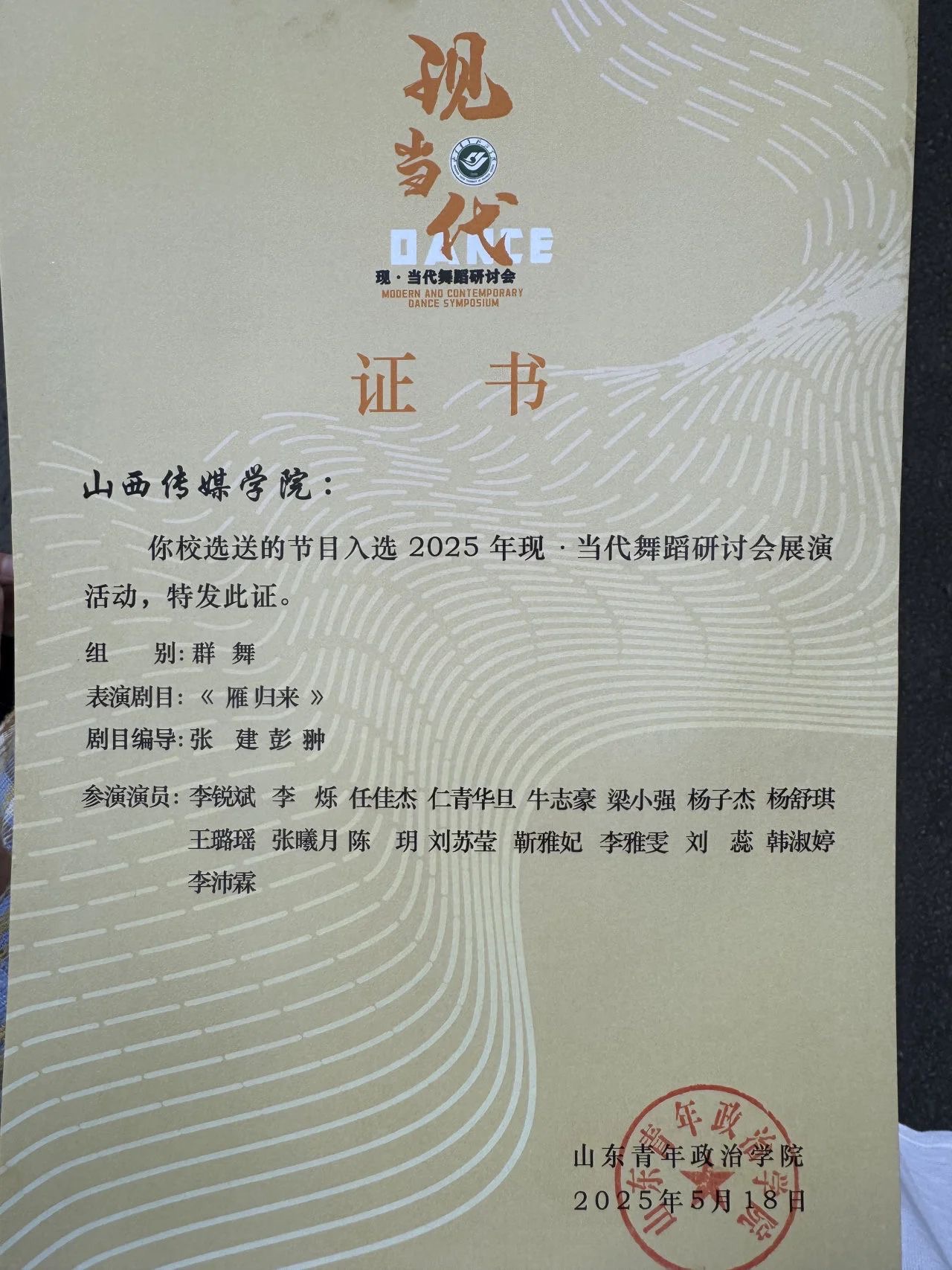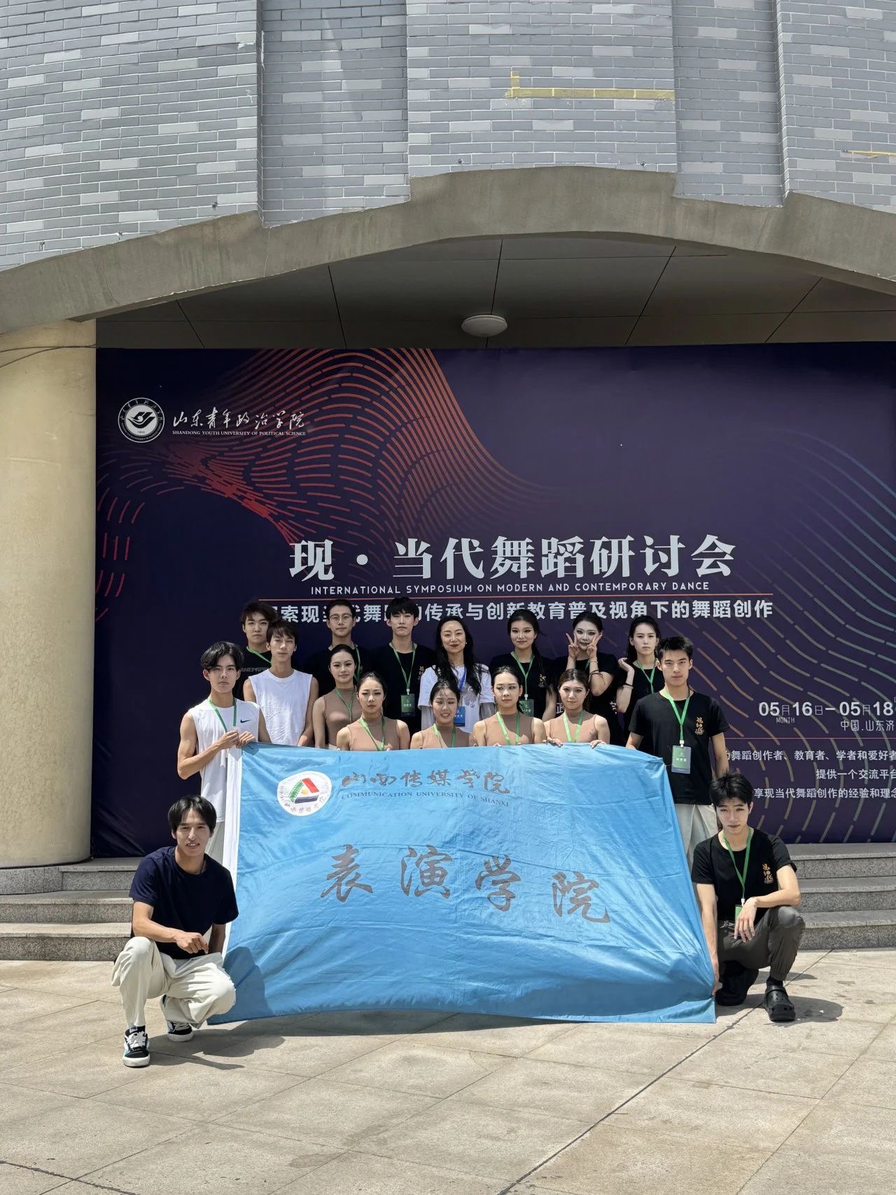 5月16−18日,我院师生团队17人奔赴山东青年政治学院。在学校、学院的大力支持下,由太阳集团tyc151cc教师仇晓莉带队舞蹈编导专业16名学生参加全国现当代舞蹈研讨会,聚焦现当代舞蹈在创新与教育普及视角下的创作探索,开启了为期三天的深度学习与交流之旅。